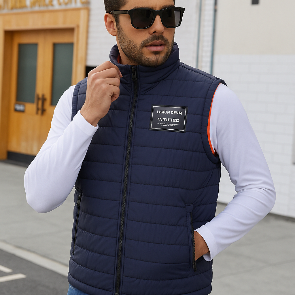 Sleeveless Navy Blue Jacket Add a sporty and refined edge to your wardrobe with the...